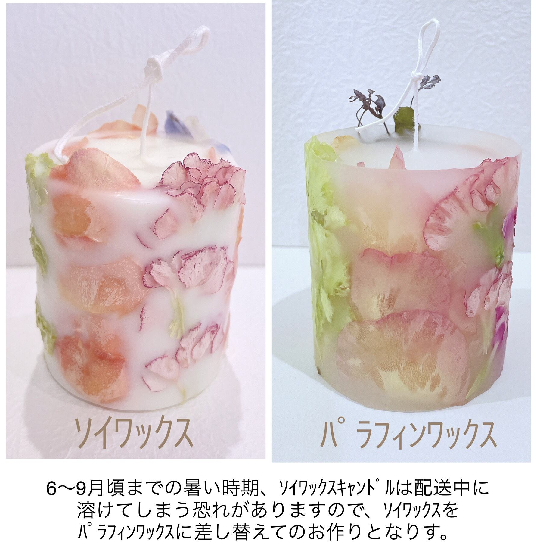 ※6~9月頃までの暑い時期、ソイワックスキャンドルは配送中に溶けてしまう恐れがありますので、ソイワックスをパラフィンワックスに差し替えてのお作りとなりす。(画像15・16参照)