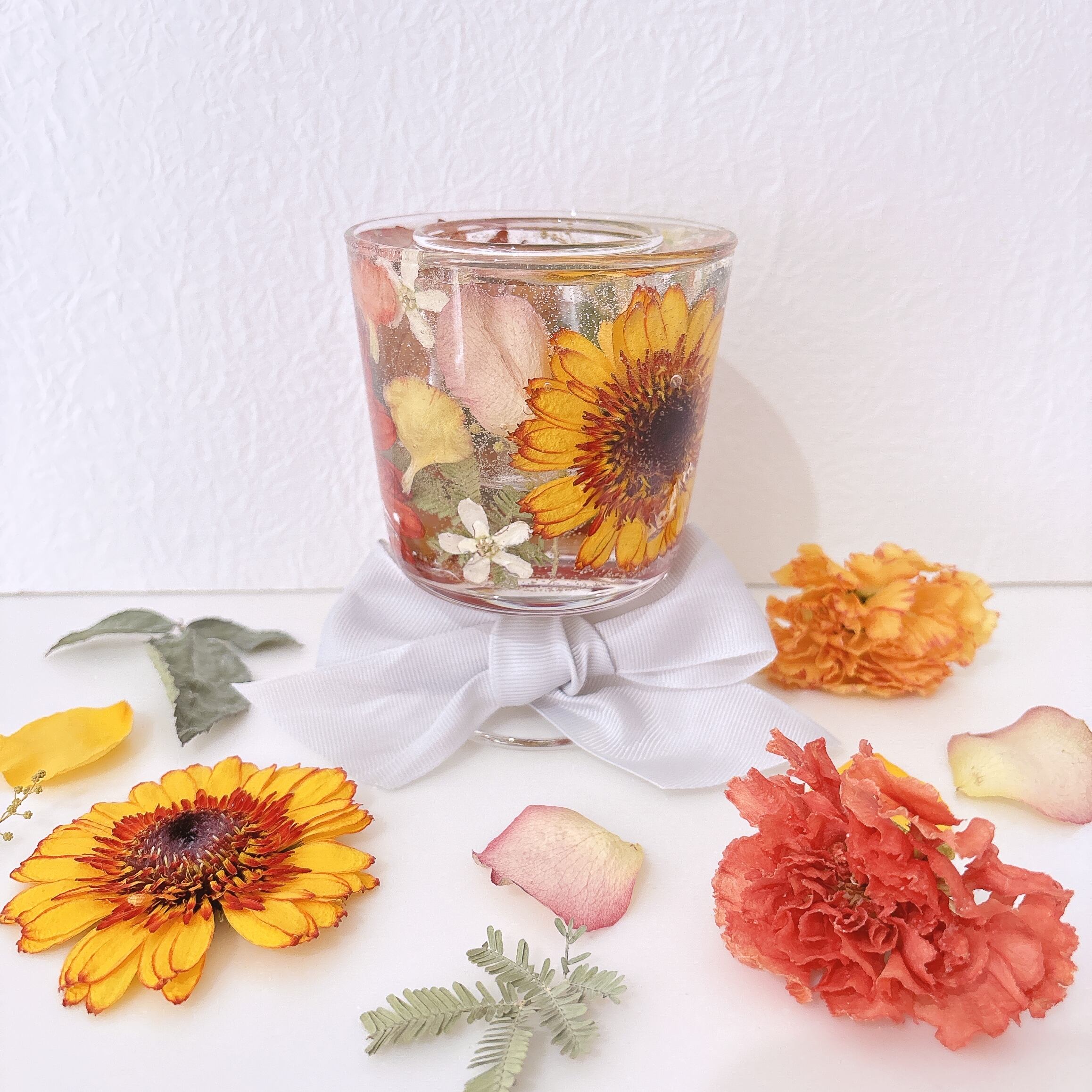 ④お送り頂いたお花をドライ加工し、ドライフラワーキャンドルを製作します。